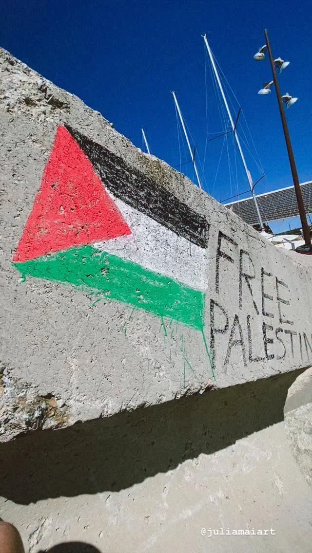 Last summer I traveled to another island, at the very other end of Europe, a calm island in the Aegean called Ikaria, where I was given the opportunity to leave a mark on the land speaking as loudly for Palestine with another large scale mural there with the help of the local pro Palestine movement. Now, back in the cold dark Icelandic winter, still witnessing a genocide, I want to take my work of visual, public solidarity further. Even though these islands might be perceived as isolated and distant places, we all share parallel experiences of resilience, cultural memory, autonomy and connection. I want my next project to visualise how we have always been connected through currents, migration routes, trade histories and now in these contemporary networks of solidarity.